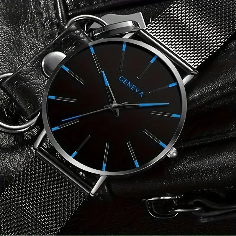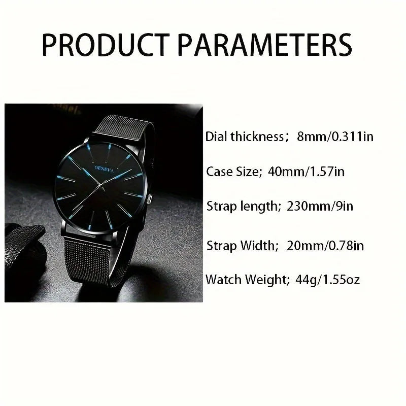 5pcs Luxury Black Stainless Steel Mesh Belt Quartz Watch With Bracelet For Men Casual Fashion Round Watch Sport Watches Set
