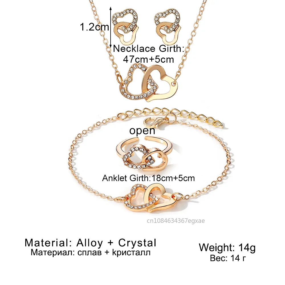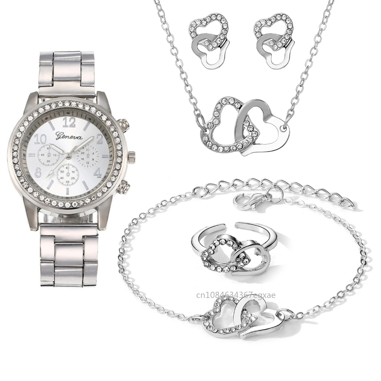 6/1PCS Set Rose Gold Luxury Watch Women Ring Necklace Earring Rhinestone Fashion Wristwatch Casual Ladies Bracelet Watches